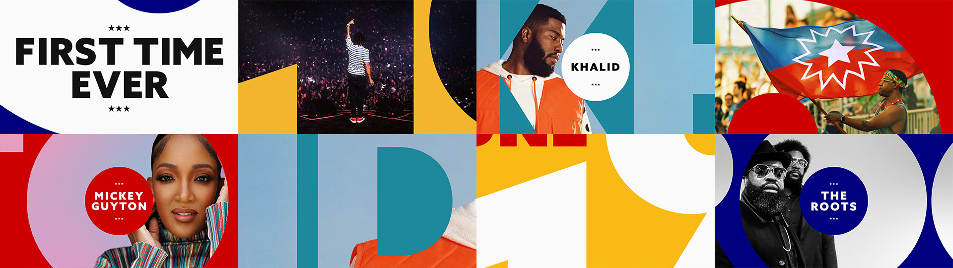 The date and artists become a central graphic device through scale, cropping, and negative space. Combined with bold color and clean structure, the system feels modern and visually striking.
